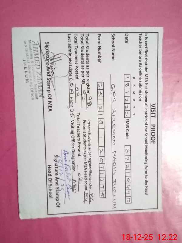 | EMIS Code: 37210440 | Name of School: GPS SULEMAN PARIS JHELUM | |||