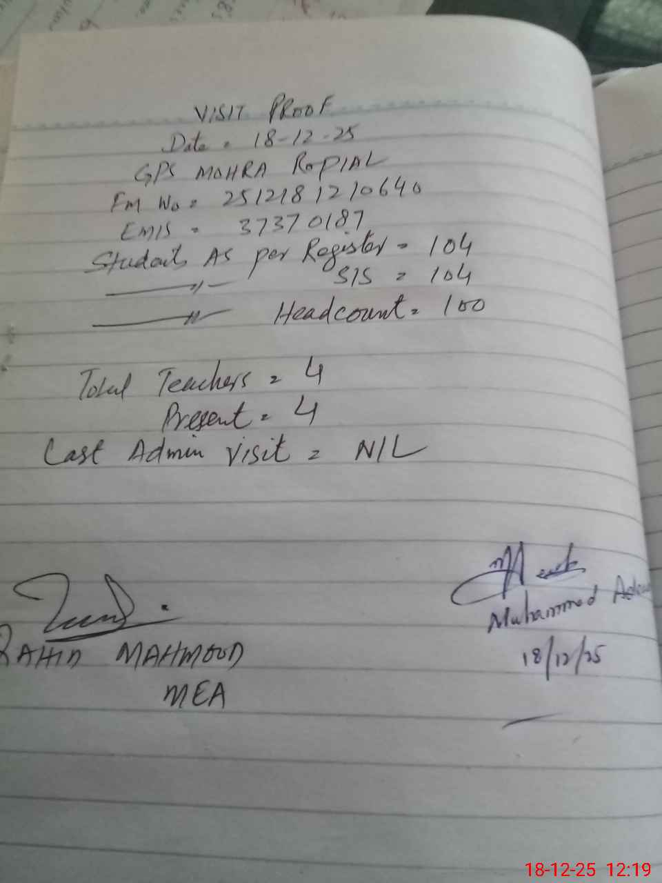 | Attendance Register | Head Teacher | MEA with School | Visit Proof |