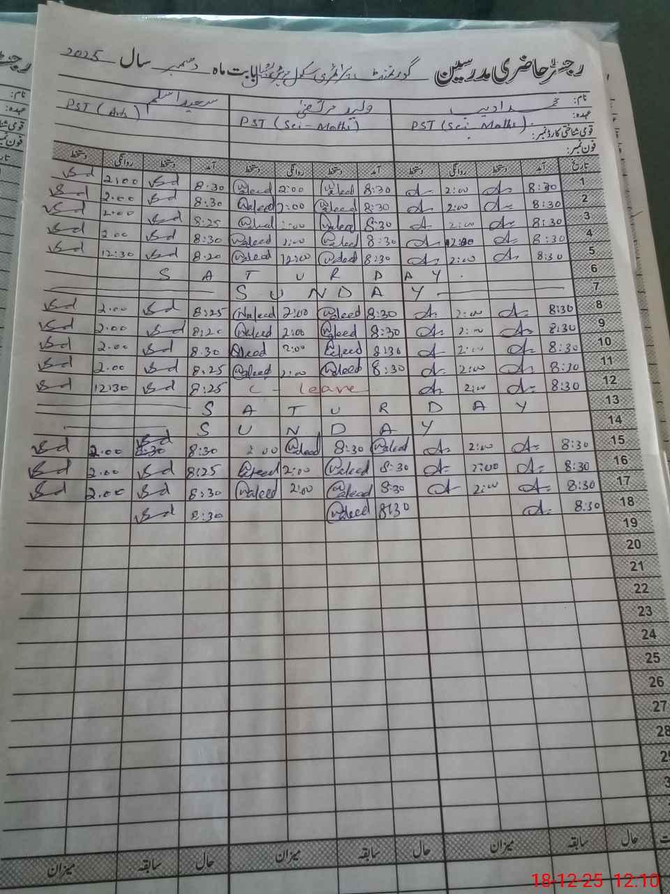 | CNIC | Full Name | Designation | R/C | Absence During Last Calender Month |