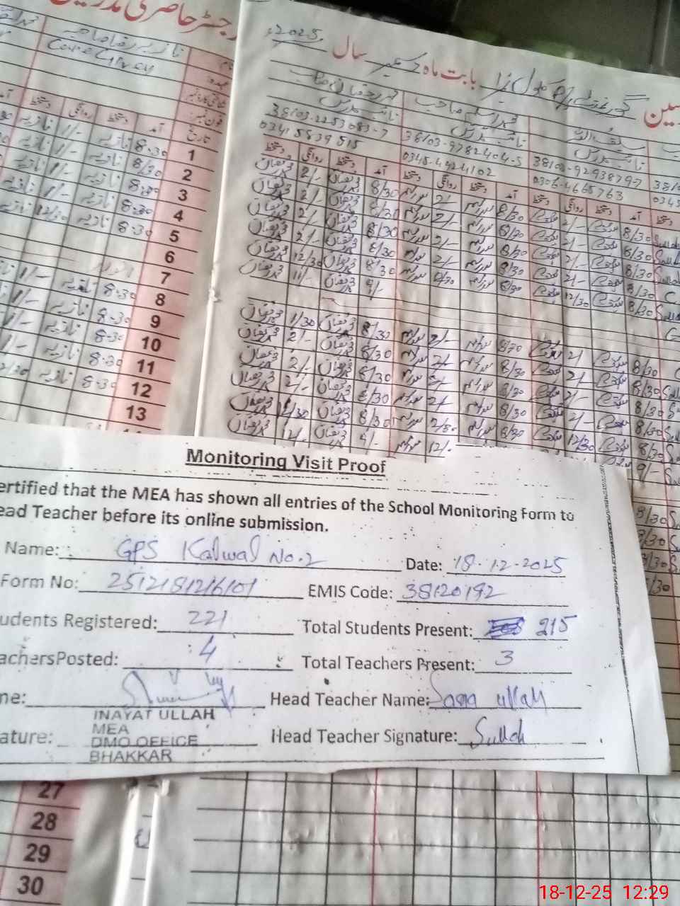 | Attendance Register | Head Teacher | MEA with School | Visit Proof |