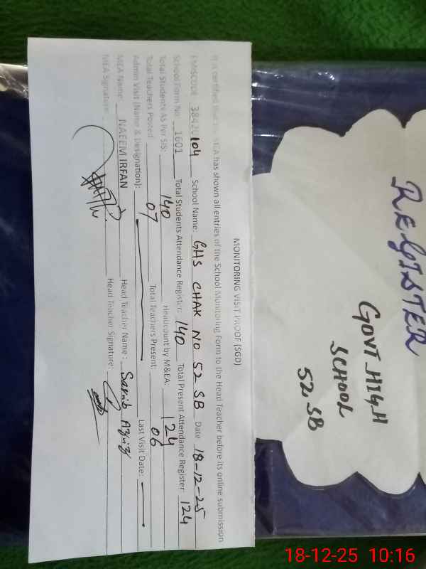 | Attendance Register | Head Teacher | MEA with School | Visit Proof |