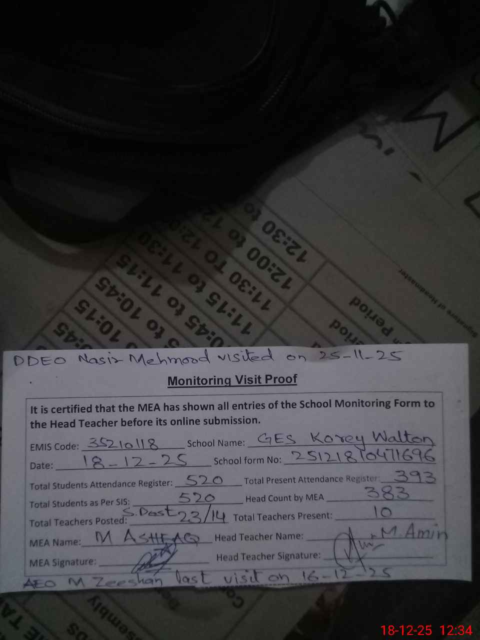 | Remarks (Use Separate Page if Required): Chowkidar Muhammad Javed attached with Polio Team but his written Orders not available so mark him absent Naib Qasid Rana Haider Ali attached with DDEO but his written Orders also not available so mark him absent Teachers Sanctioned Post 23 and Filled 14 DDEO Nasir Mehmood visited on 25-11-25 AEO Muhammad Zeeshan last visited on 16-12-25 270000 rupees received for construction of 03 new toilets which are under construction now EST Sehar Bashir removed from service since 10-05-23 while letter received dated 01-10-25 from DEO (MEE) Cleaning is not up to standard Floor broken at some points 35210118 | |||||