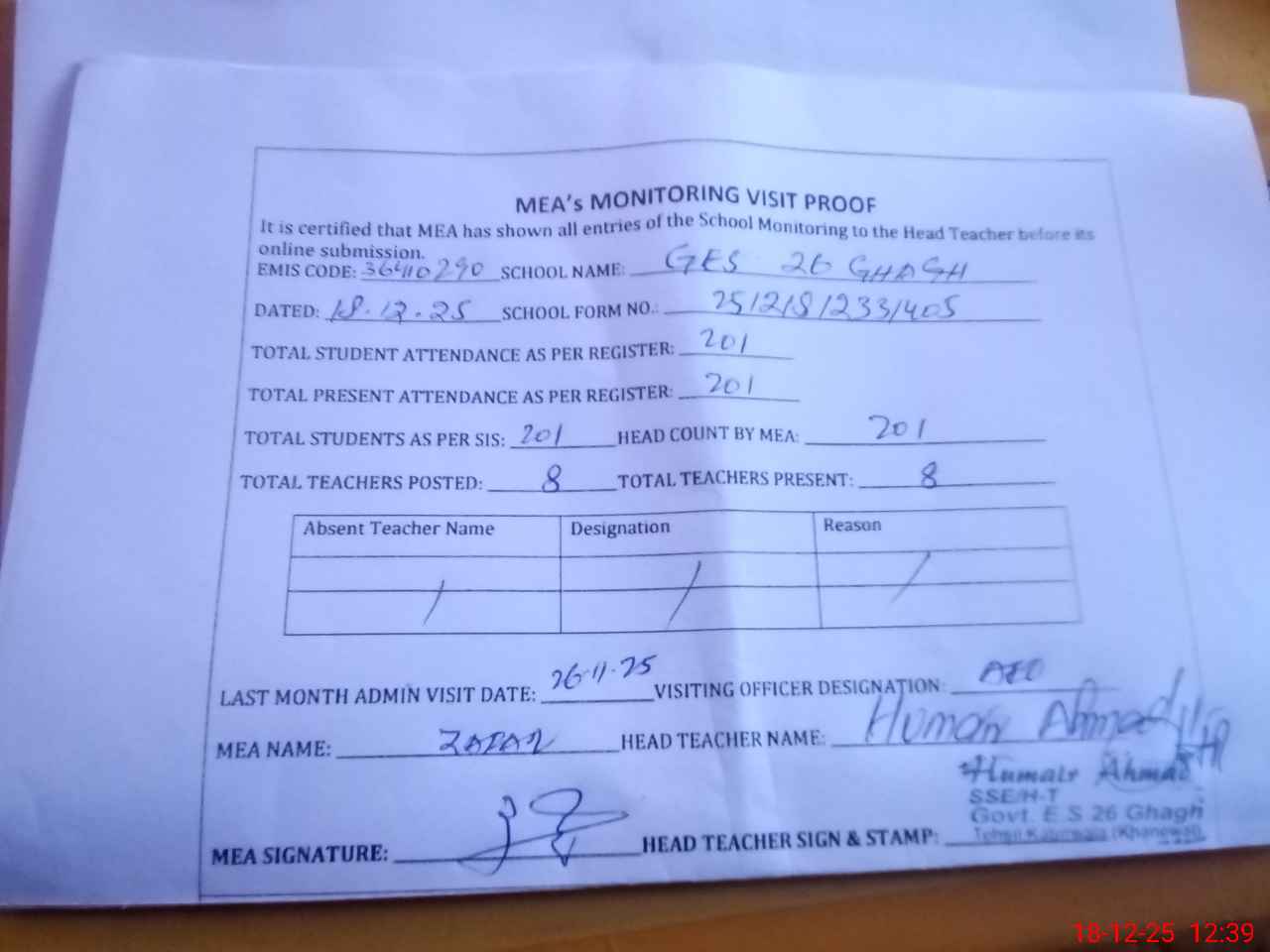 | Attendance Register | Head Teacher | MEA with School | Visit Proof |