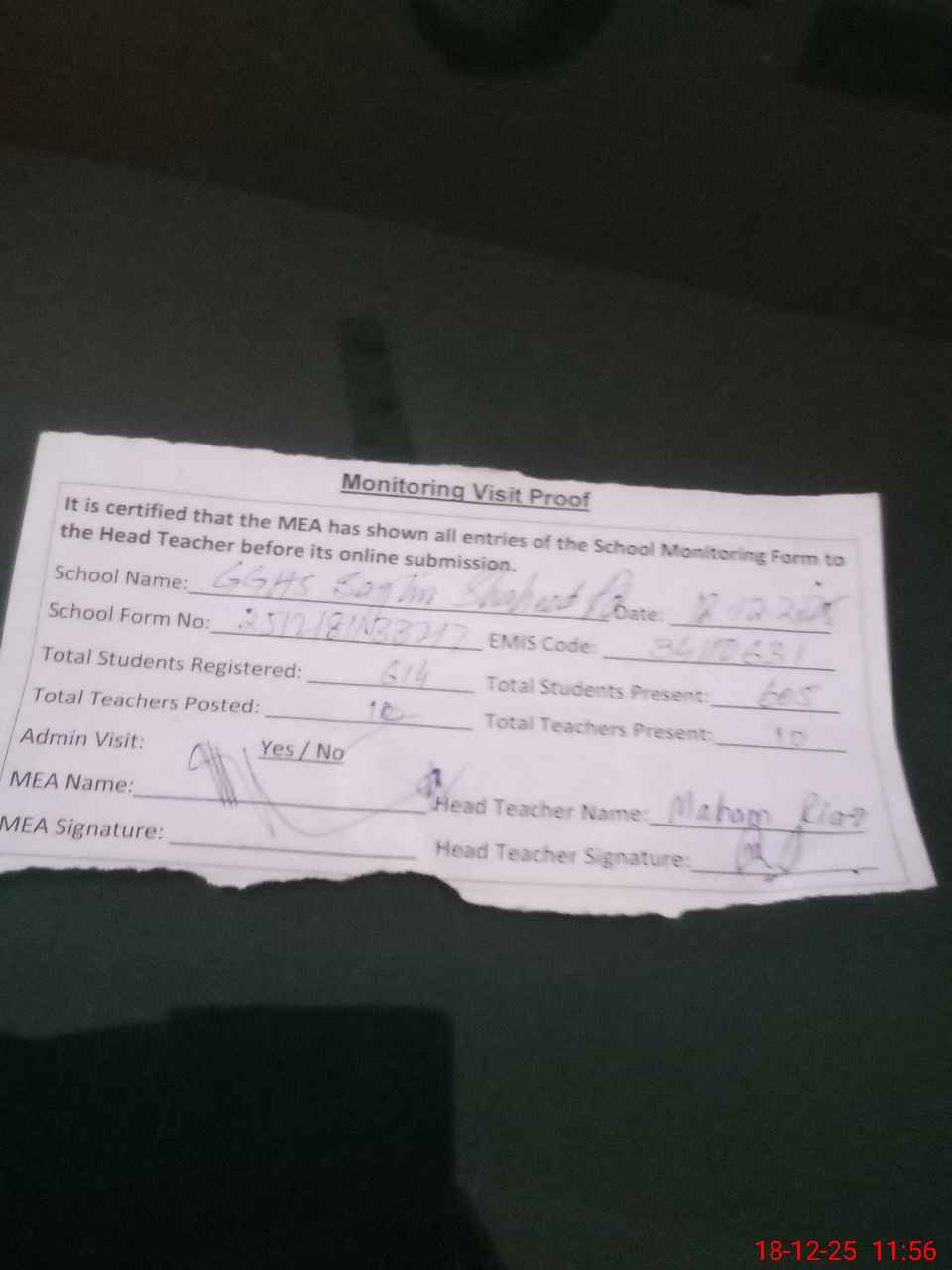 | Attendance Register | Head Teacher | MEA with School | Visit Proof |
