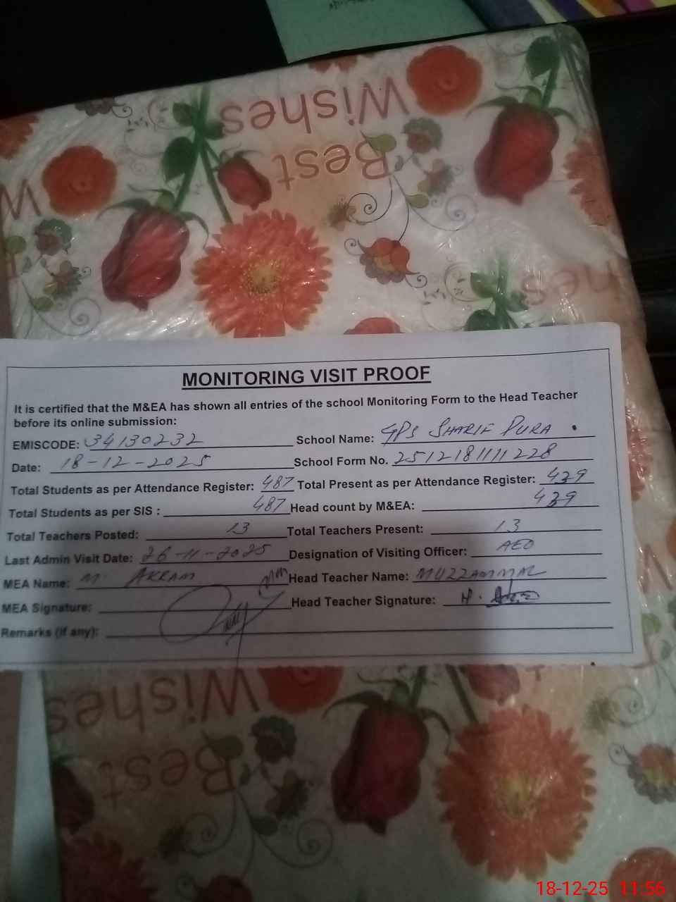 | Attendance Register | Head Teacher | MEA with School | Visit Proof |