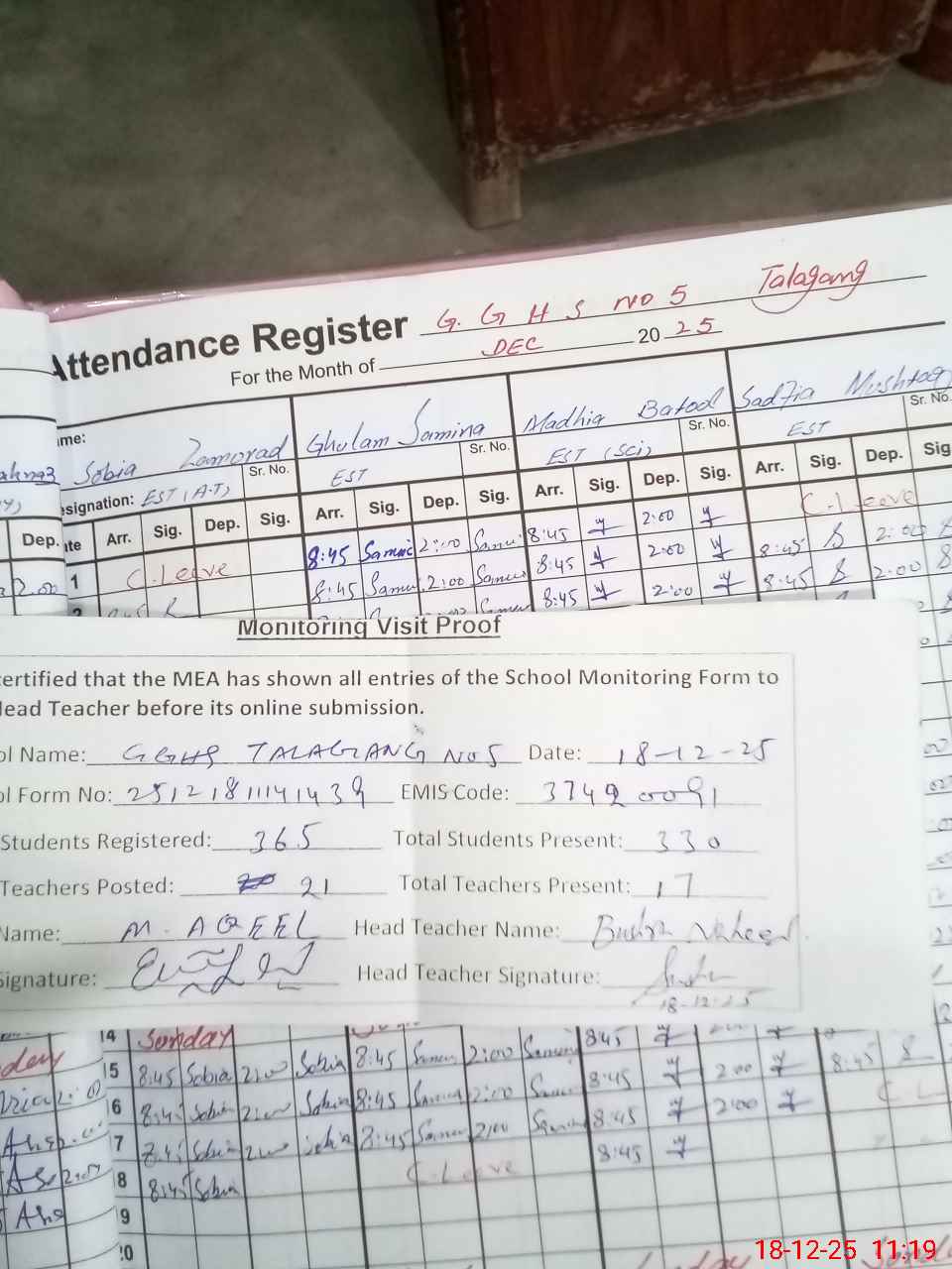 | Attendance Register | Head Teacher | MEA with School | Visit Proof |
