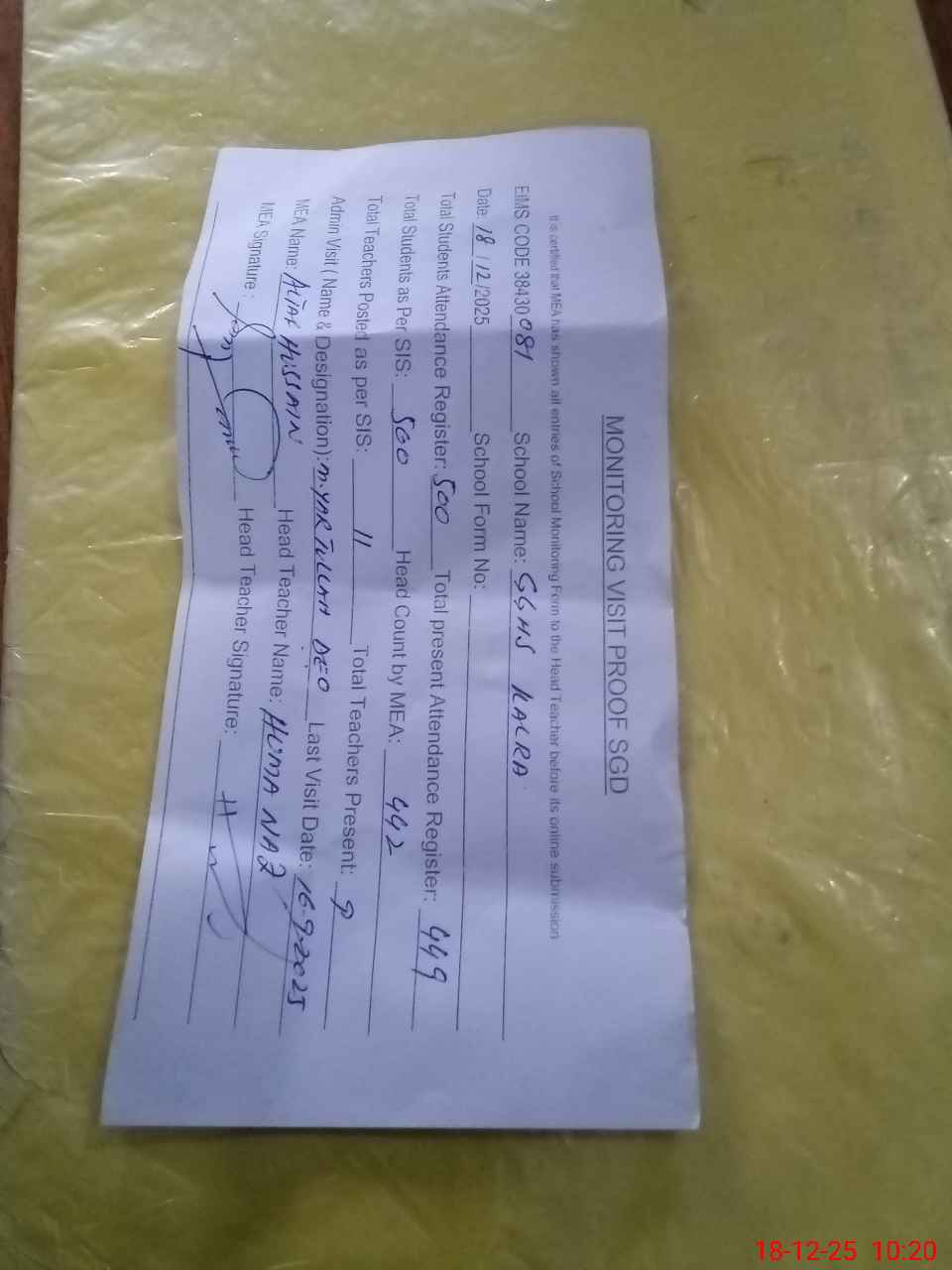 | Attendance Register | Head Teacher | MEA with School | Visit Proof |