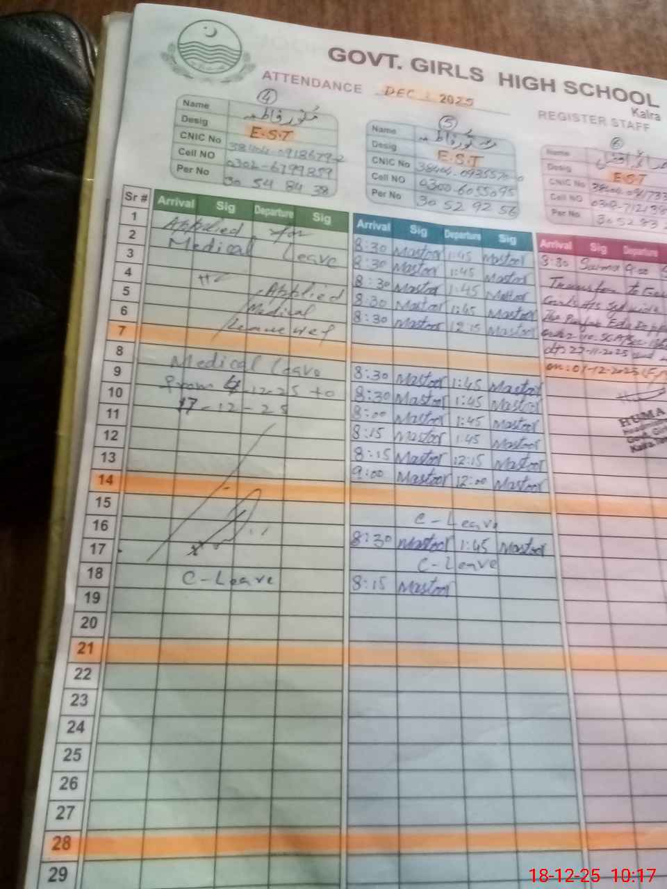 | CNIC | Full Name | Designation | R/C | Absence during last cal. month |