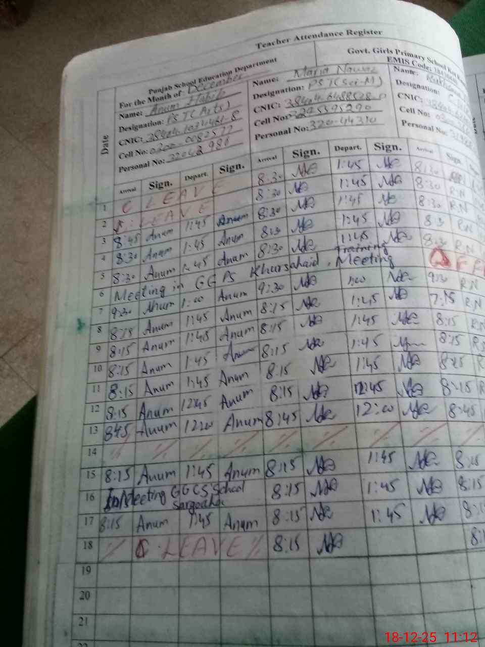 | CNIC | Full Name | Designation | R/C | Absence During Last Calender Month |