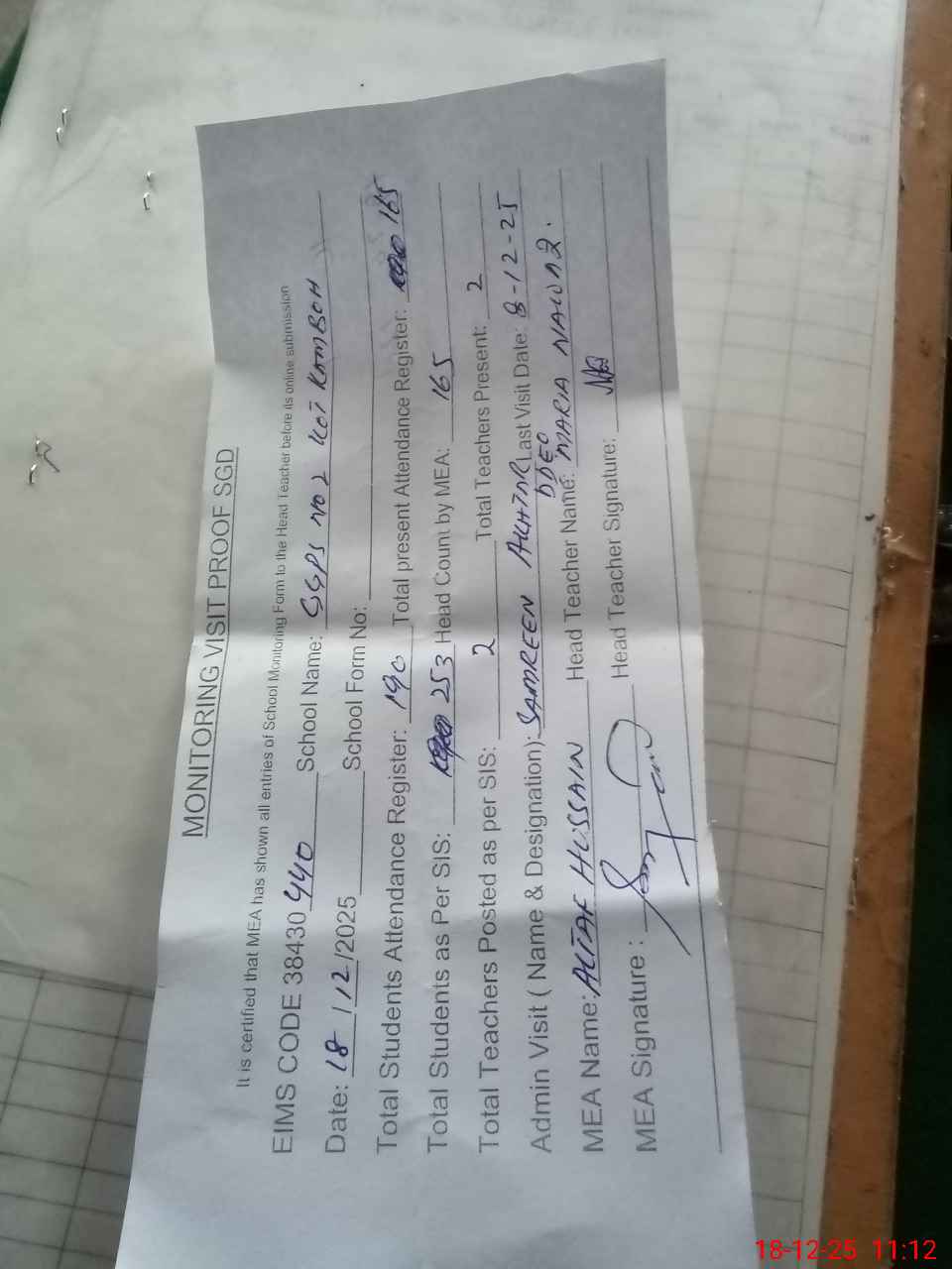 | Attendance Register | Head Teacher | MEA with School | Visit Proof |
