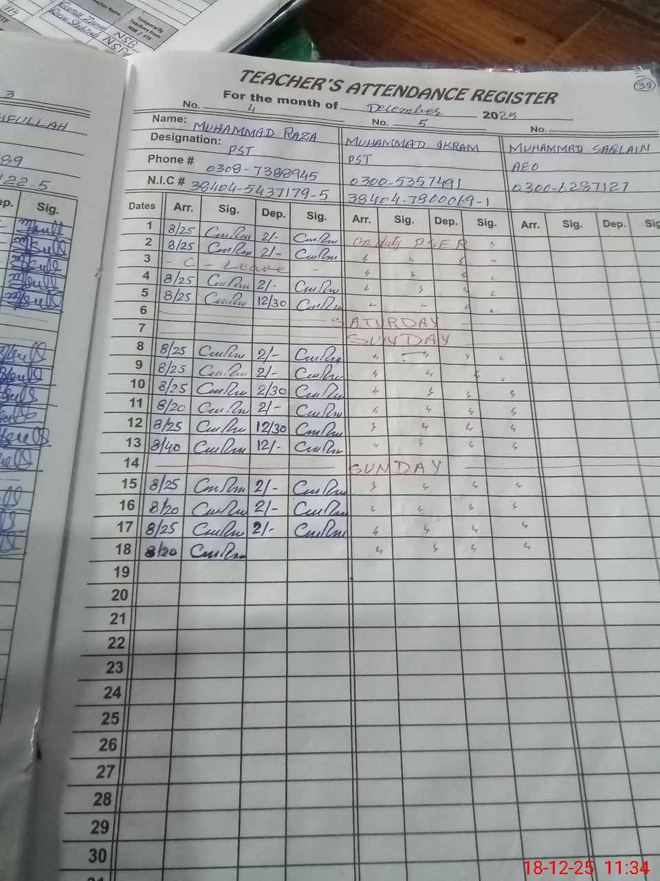 | CNIC | Full Name | Designation | R/C | Absence during last cal. month |