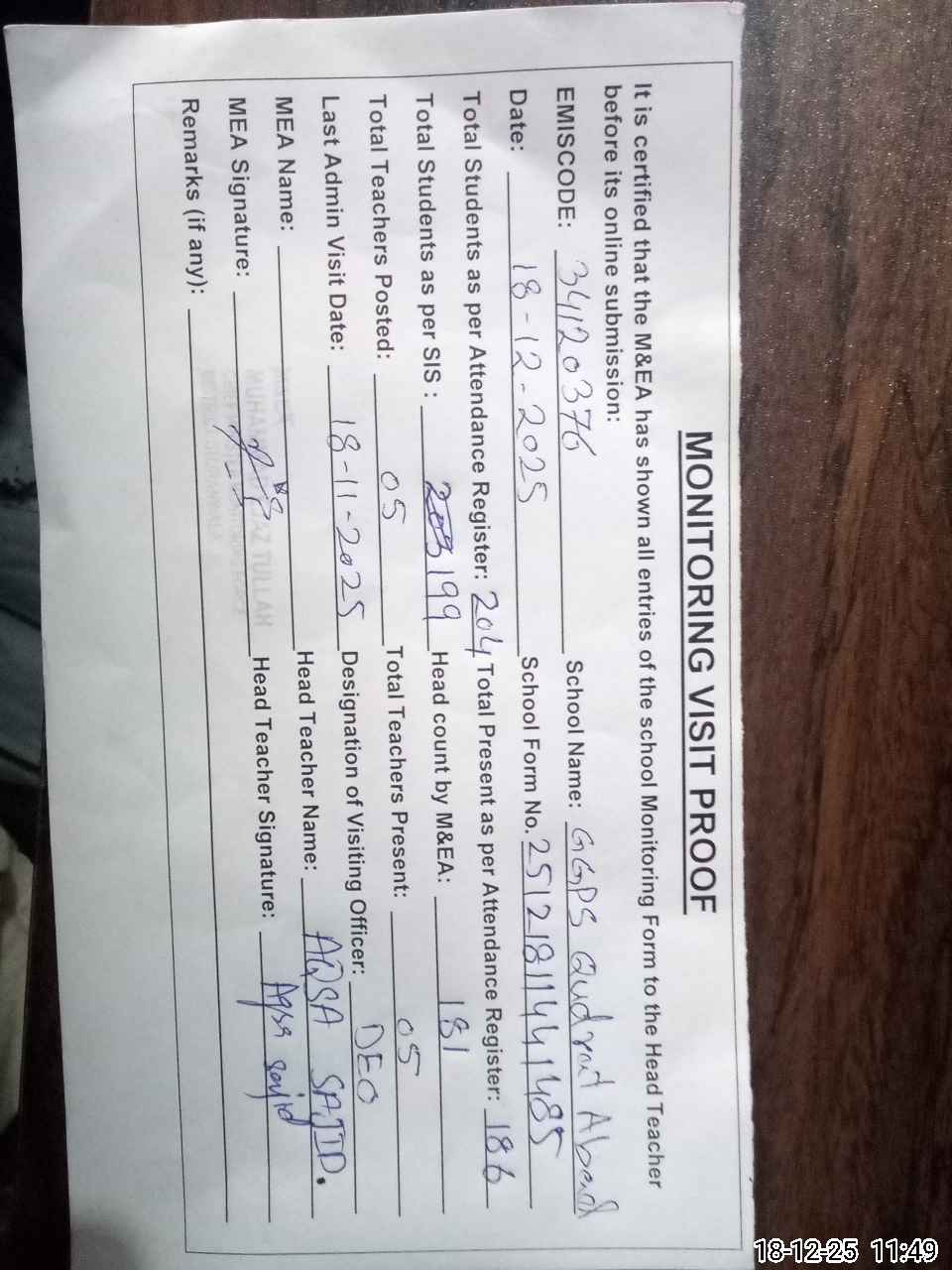 | Attendance Register | Head Teacher | MEA with School | Visit Proof |