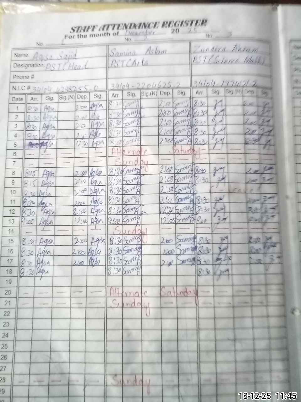 | CNIC | Full Name | Designation | R/C | Absence during last cal. month |