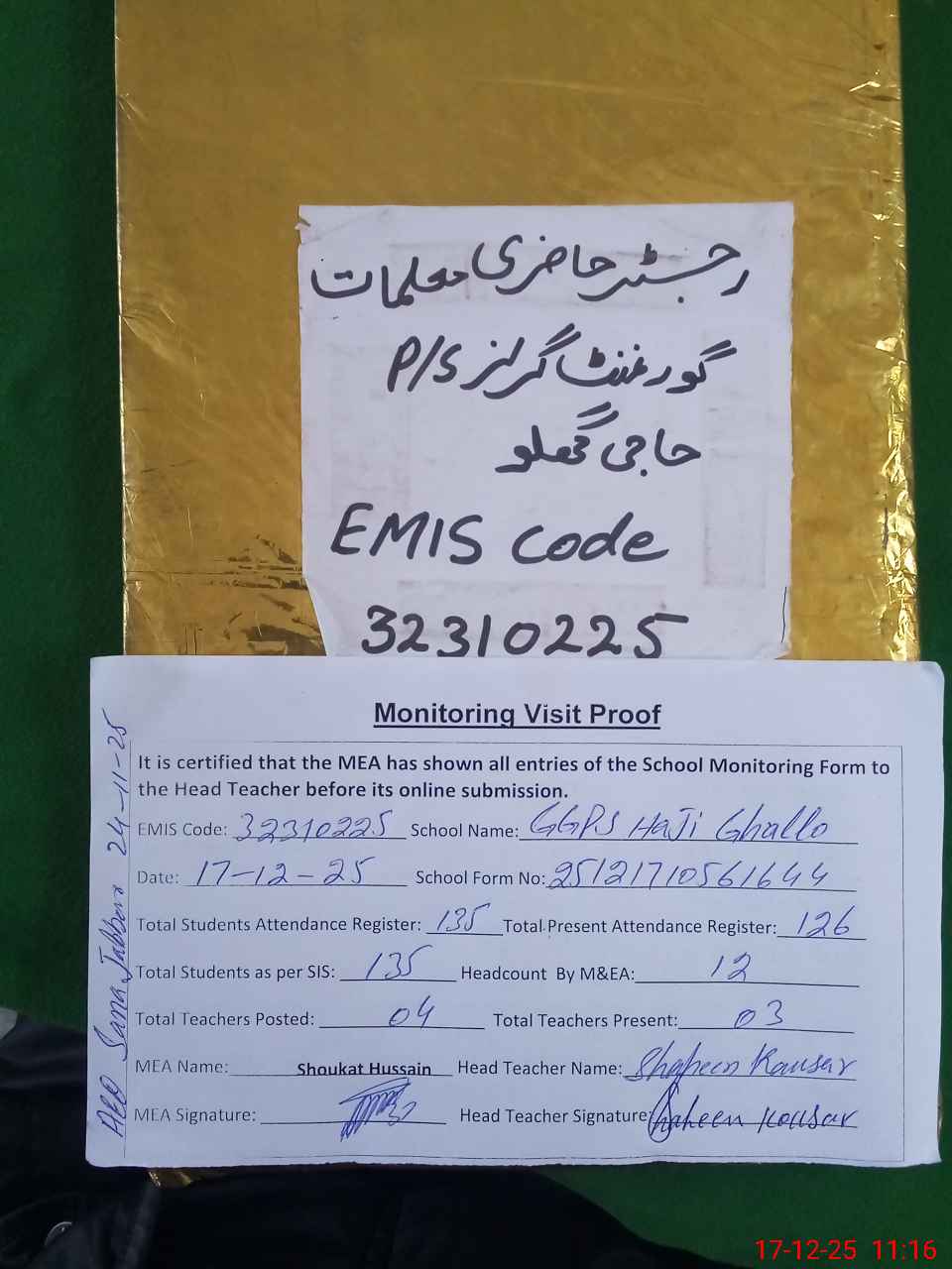 | Attendance Register | Head Teacher | MEA with School | Visit Proof |