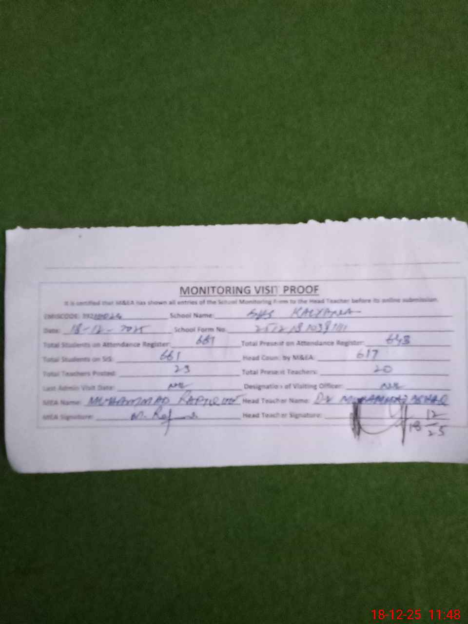 | Attendance Register | Head Teacher | MEA with School | Visit Proof |