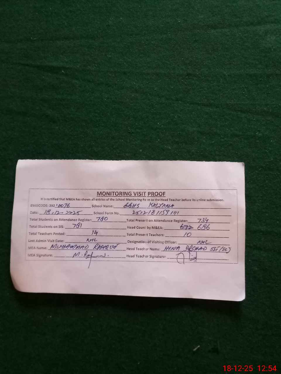 | Attendance Register | Head Teacher | MEA with School | Visit Proof |