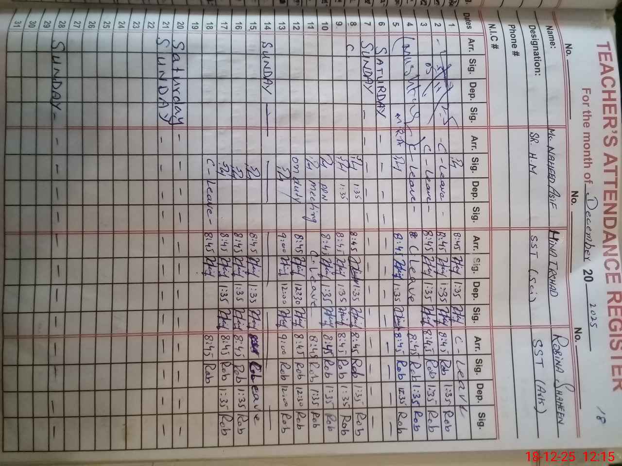 | CNIC | Full Name | Designation | R/C | Absence During Last Calender Month |