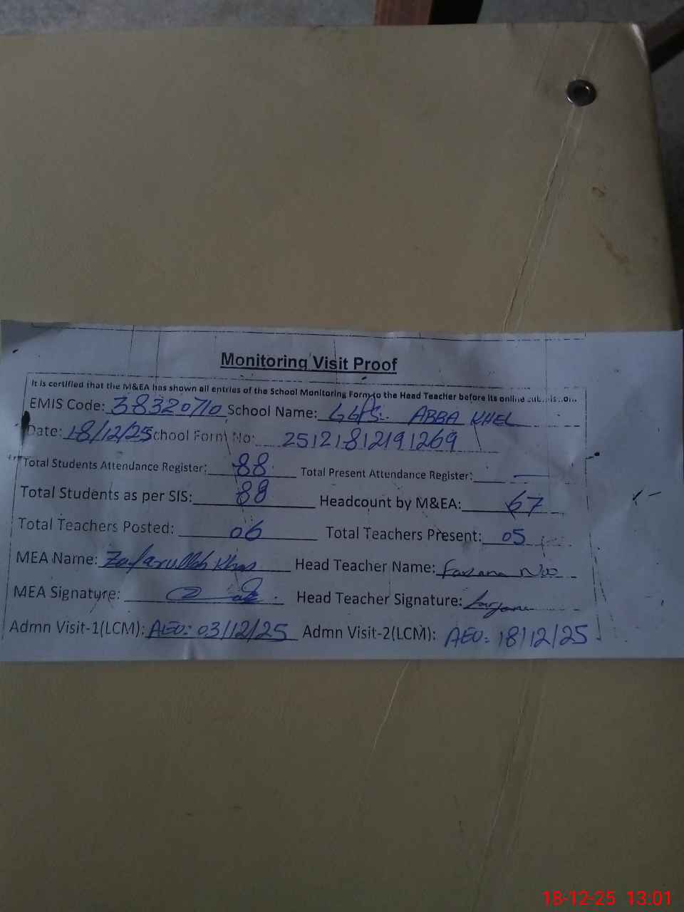 | EMIS Code: 38320710 | Name of School: GGPS ABBA KHEL | |||