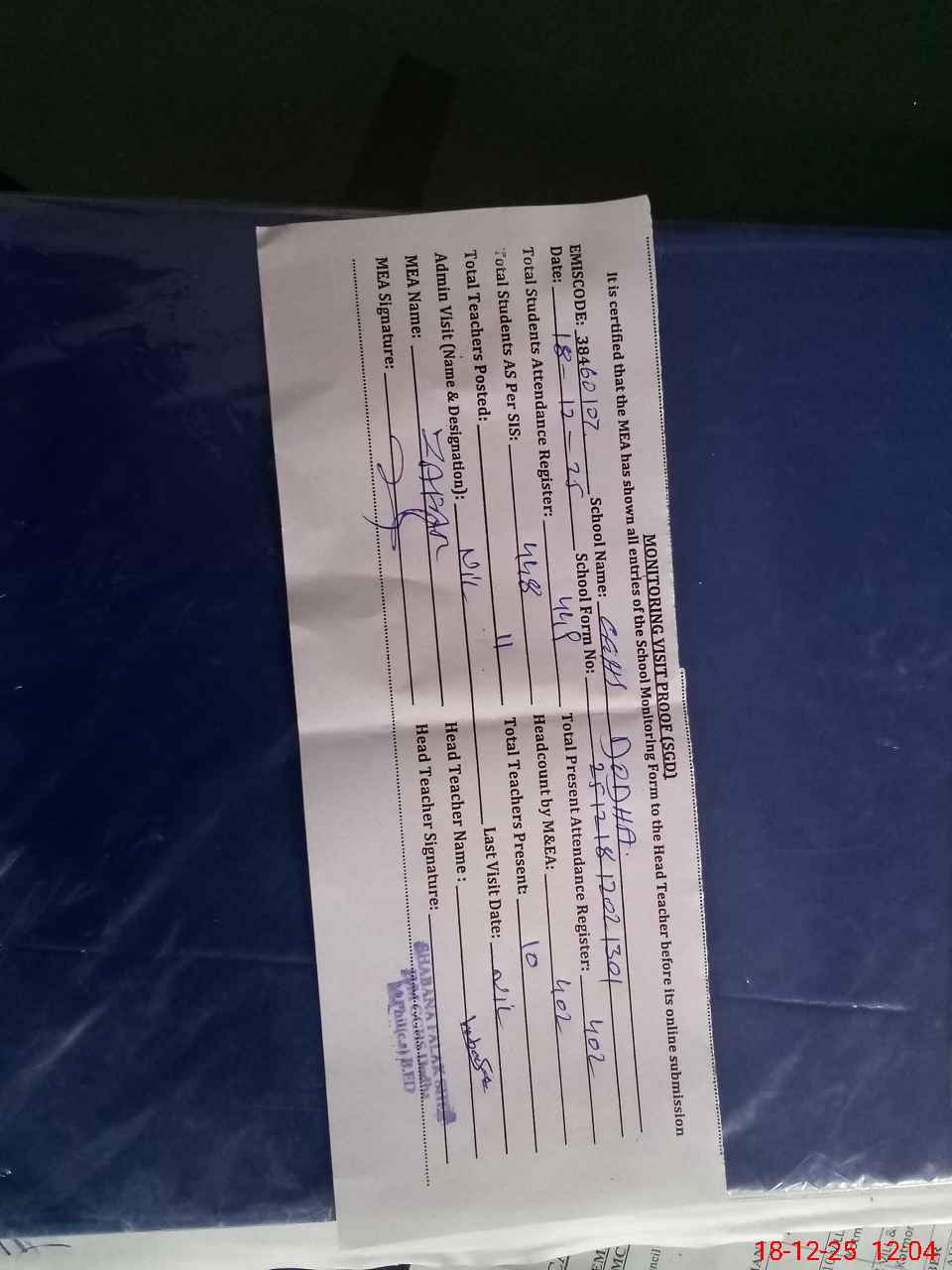 | Attendance Register | Head Teacher | MEA with School | Visit Proof |