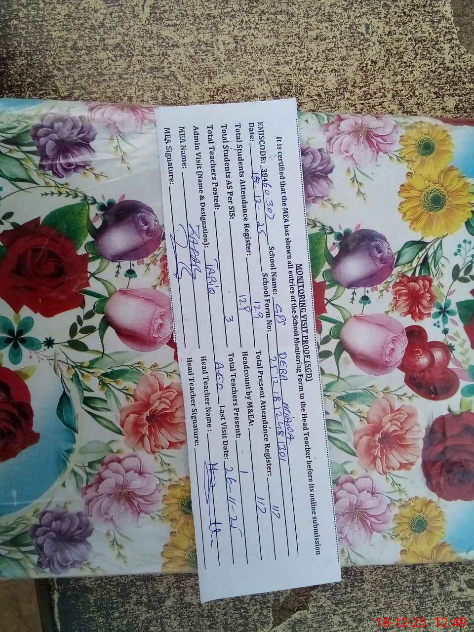 | Attendance Register | Head Teacher | MEA with School | Visit Proof |