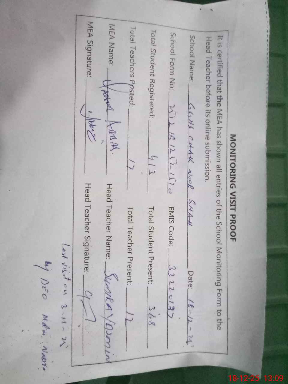 | Certified that this School was Inspected by the Undersigned MEA/DMO Today and the Information Stated Above is as Per Record. | |||||
