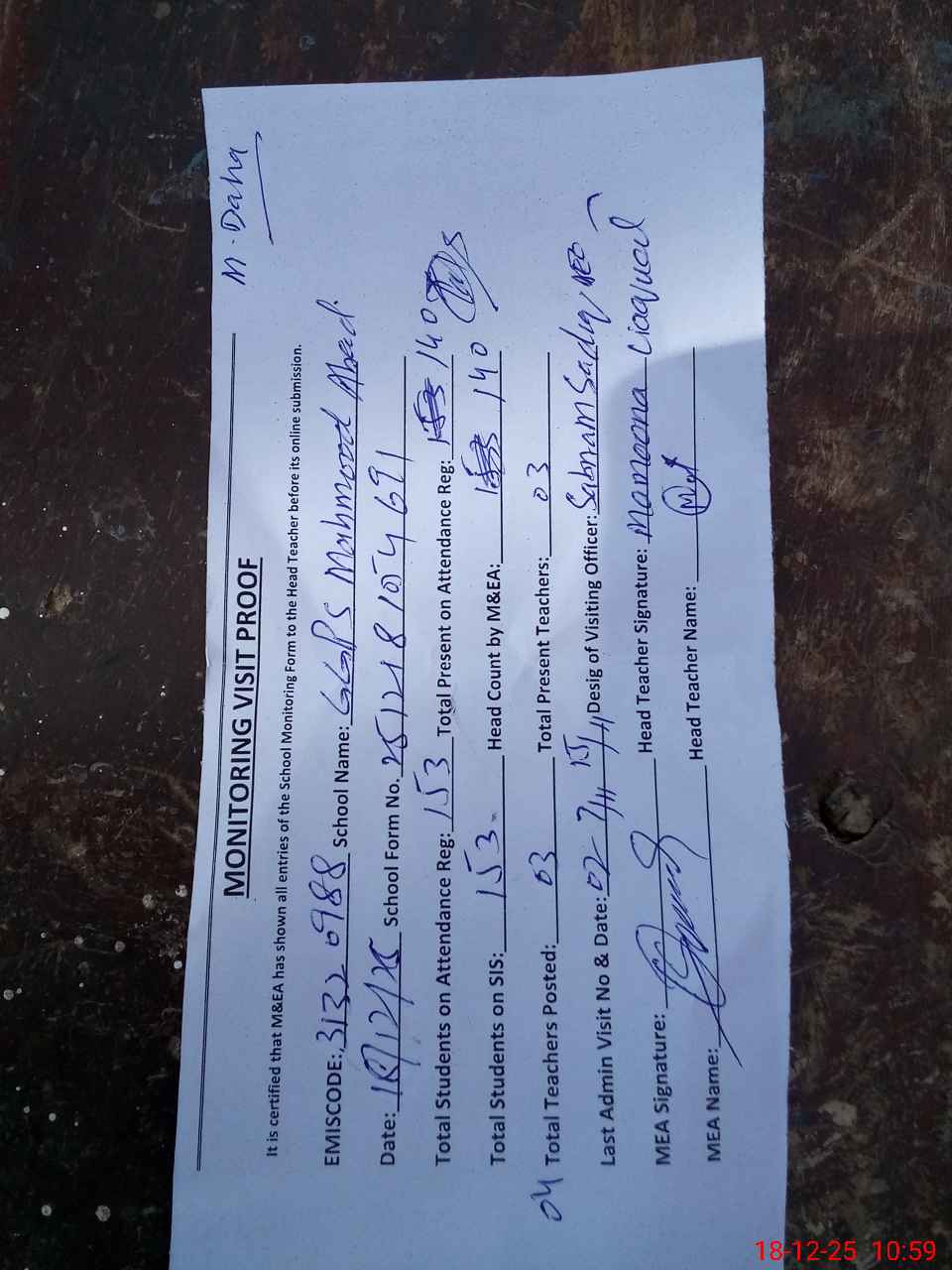 | Attendance Register | Head Teacher | MEA with School | Visit Proof |