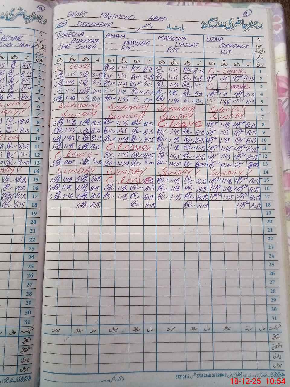 | CNIC | Full Name | Designation | R/C | Absence During Last Calender Month |