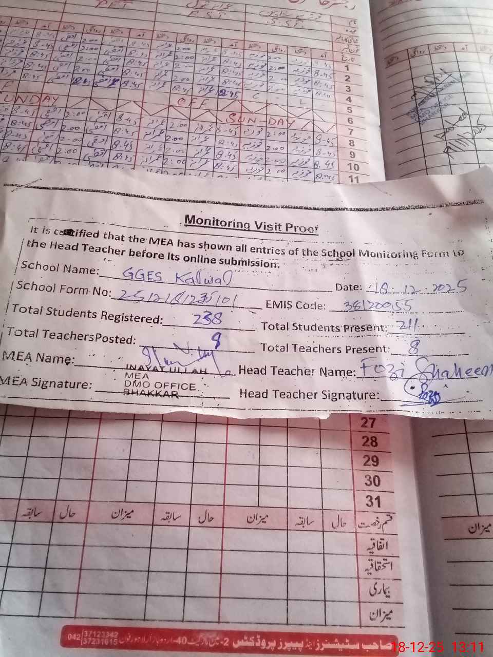 | Attendance Register | Head Teacher | MEA with School | Visit Proof |