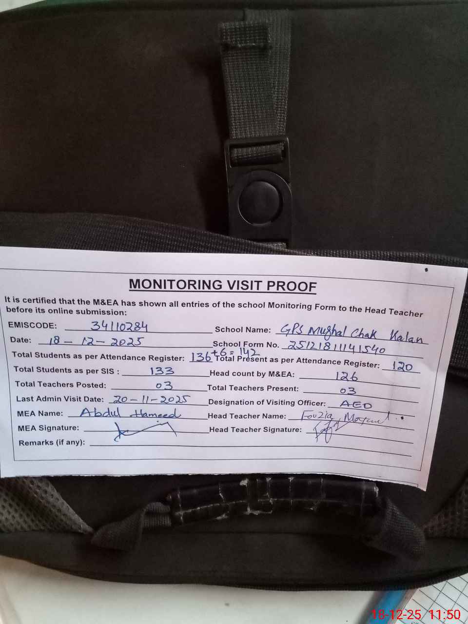 | Attendance Register | Head Teacher | MEA with School | Visit Proof |