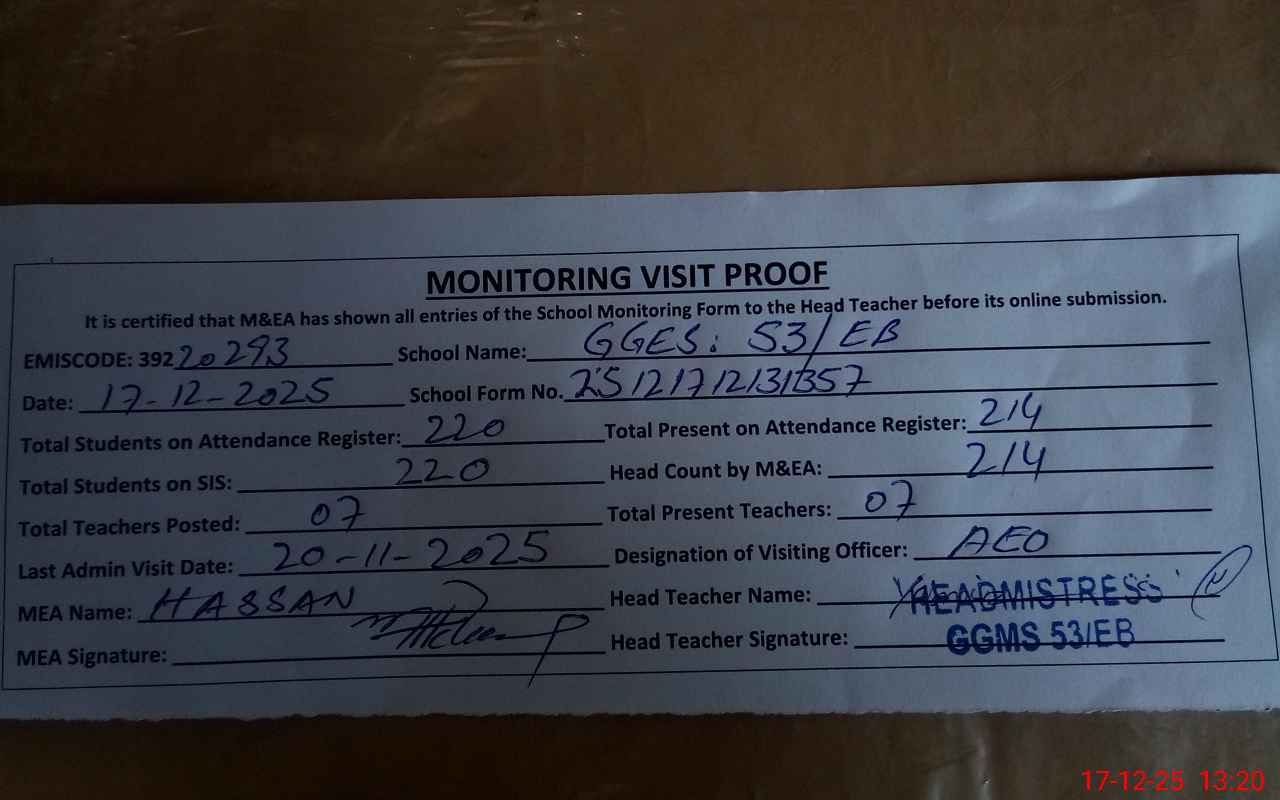 | EMIS Code: 39220293 | Name of School: GGES 53 EB | |||