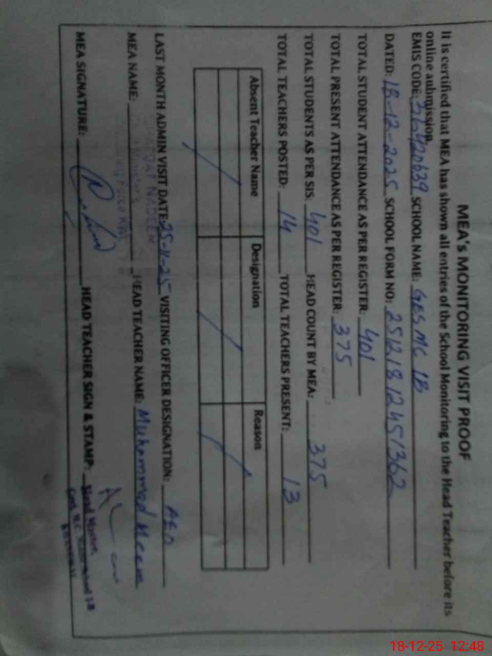 | Attendance Register | Head Teacher | MEA with School | Visit Proof |