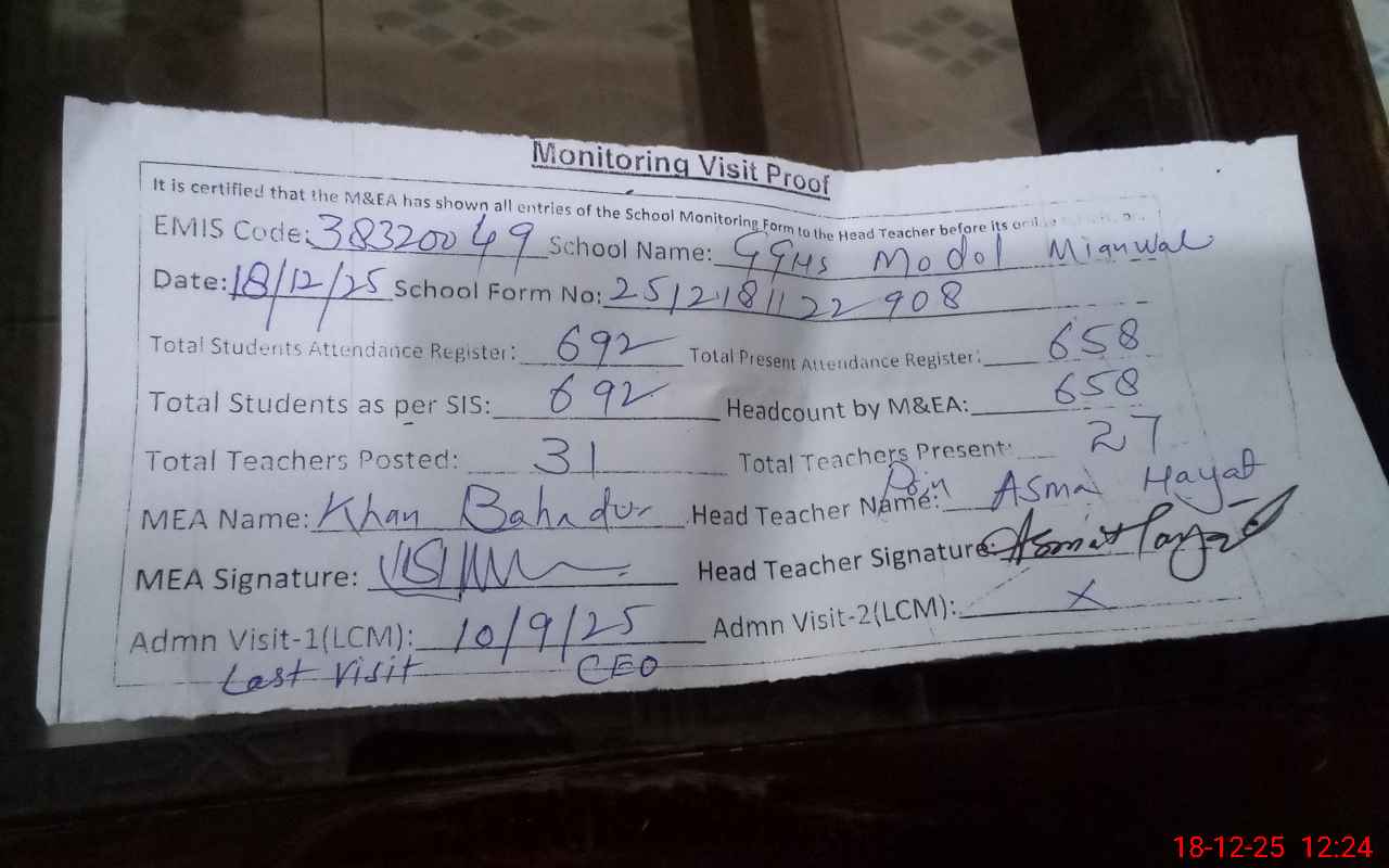 | Certified that this School was Inspected by the Undersigned MEA/DMO Today and the Information Stated Above is as Per Record. | |||||