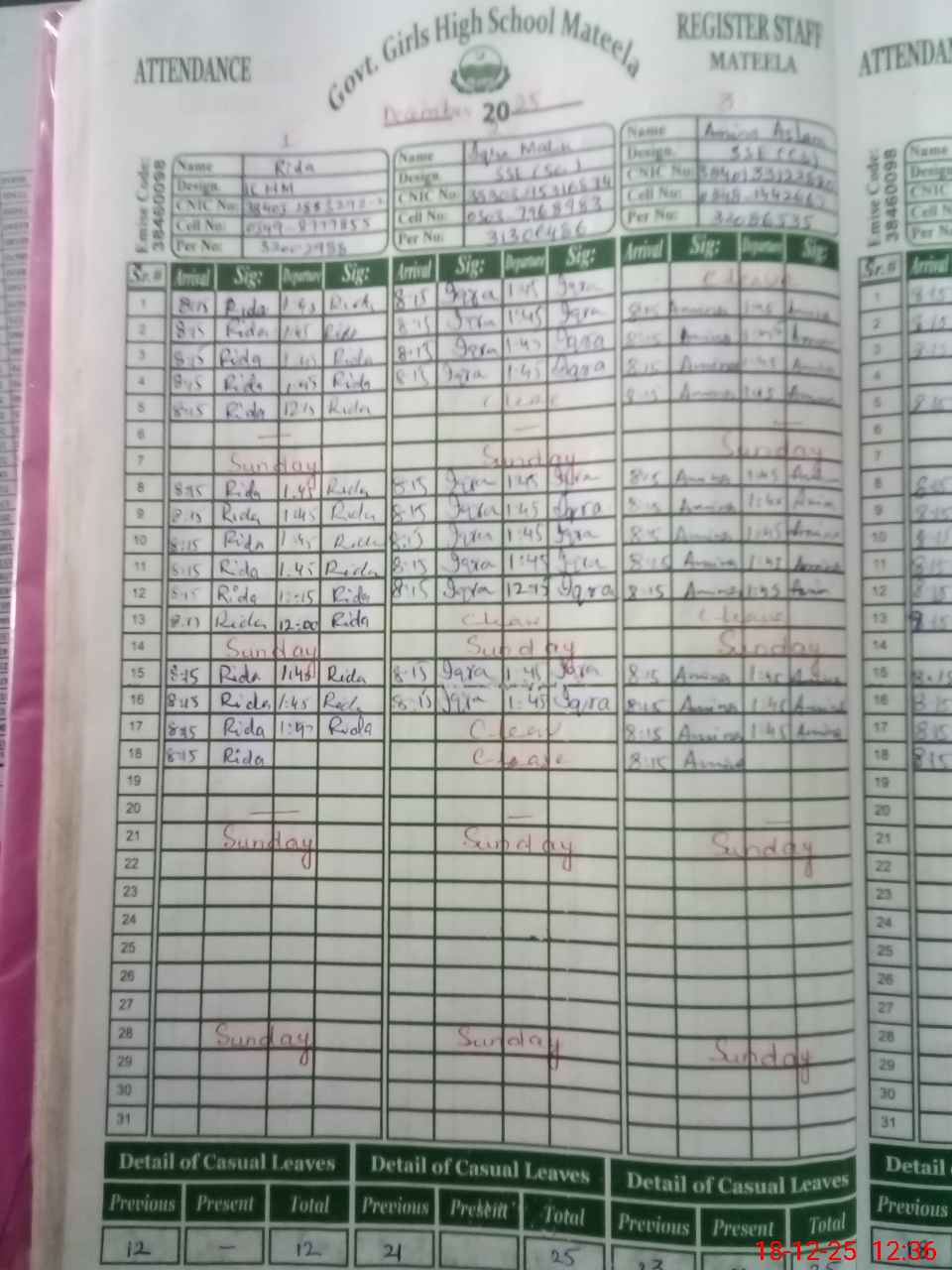 | CNIC | Full Name | Designation | R/C | Absence during last cal. month |