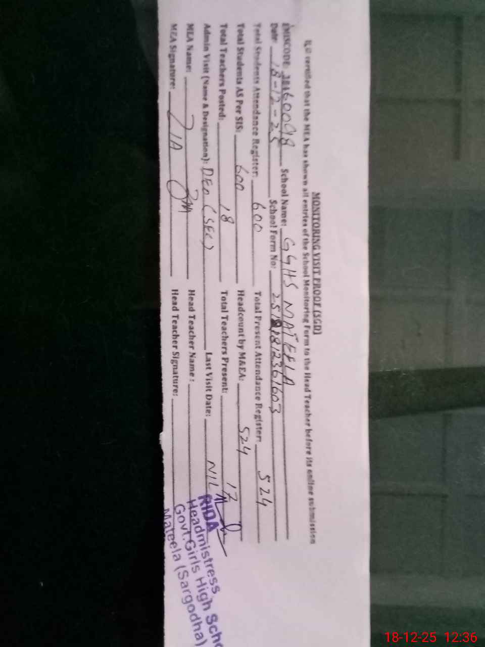 | Attendance Register | Head Teacher | MEA with School | Visit Proof |