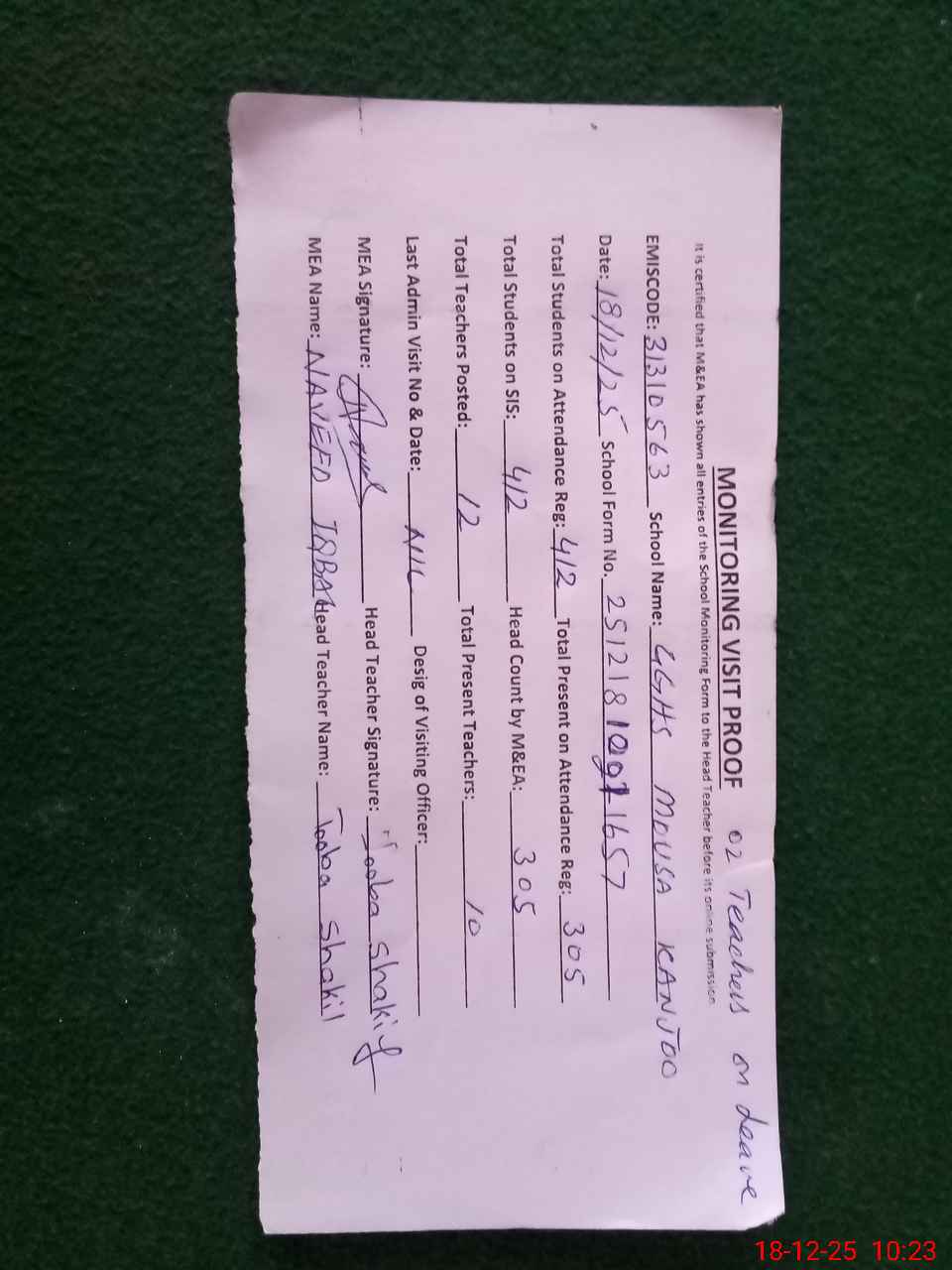 | Attendance Register | Head Teacher | MEA with School | Visit Proof |
