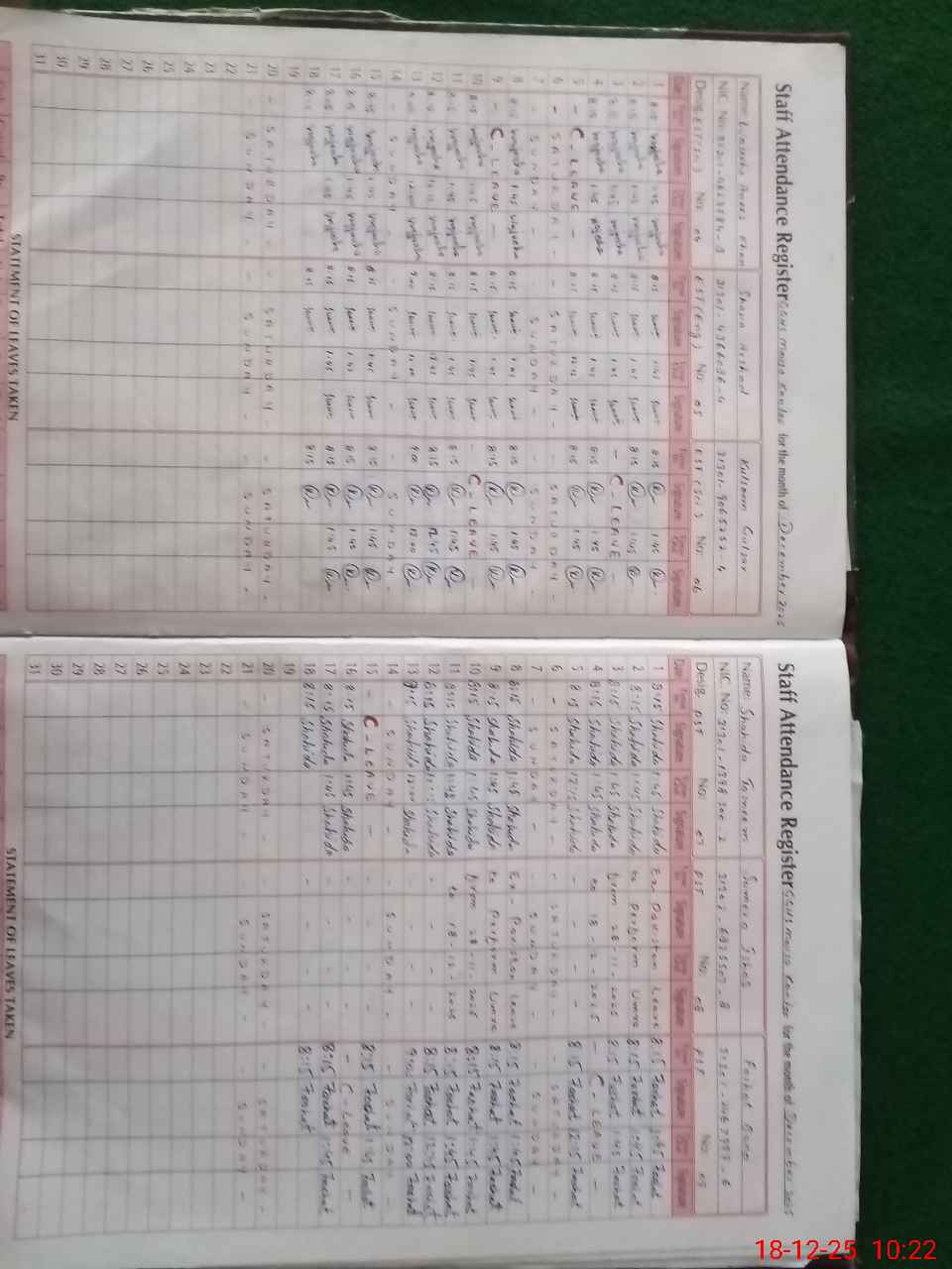 | CNIC | Full Name | Designation | R/C | Absence During Last Calender Month |