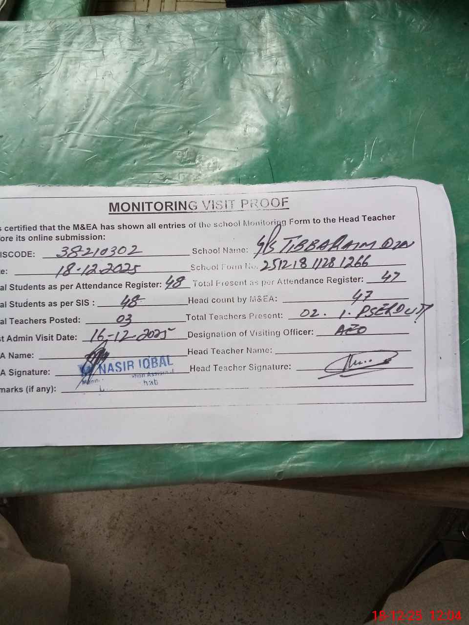 | Attendance Register | Head Teacher | MEA with School | Visit Proof |