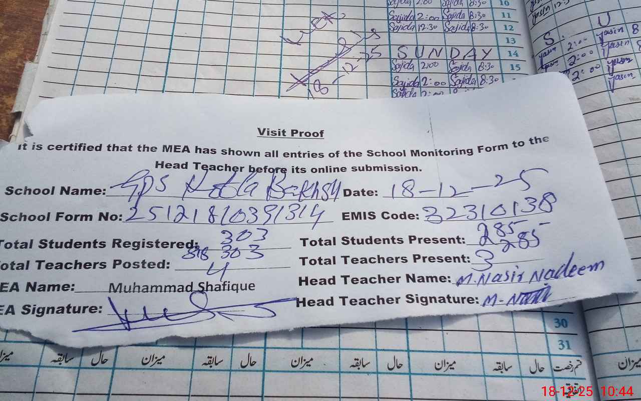 | Attendance Register | Head Teacher | MEA with School | Visit Proof |