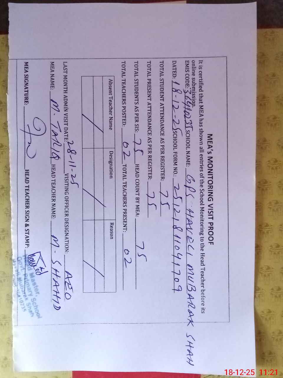 | Attendance Register | Head Teacher | MEA with School | Visit Proof |