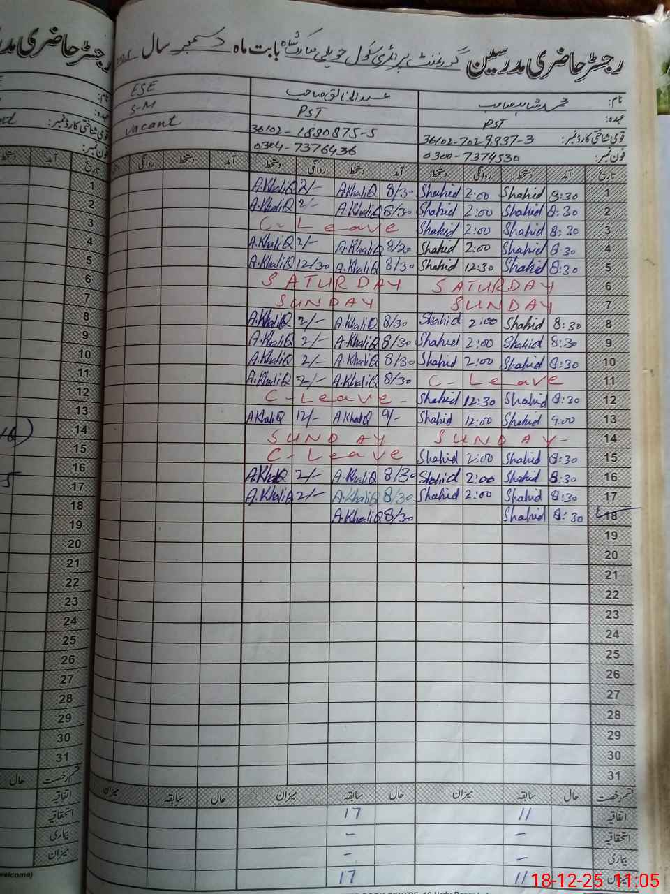 | CNIC | Full Name | Designation | R/C | Absence During Last Calender Month |
