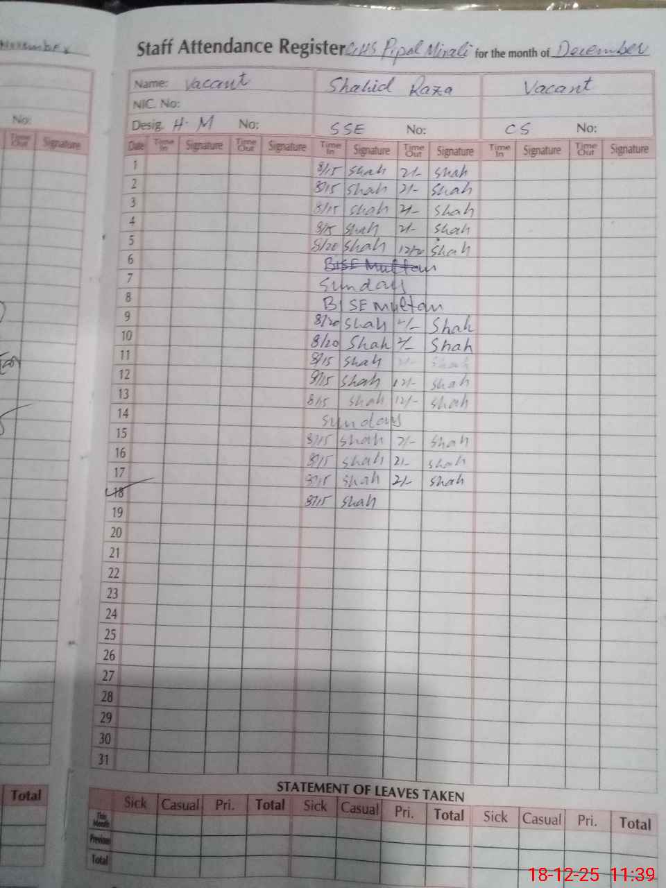 | CNIC | Full Name | Designation | R/C | Absence During Last Calender Month |