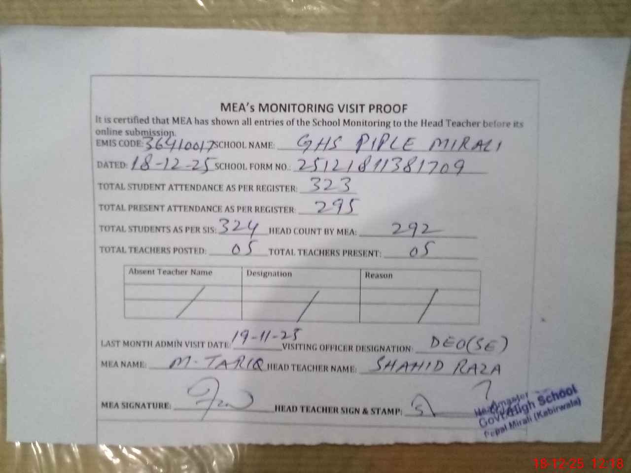 | Attendance Register | Head Teacher | MEA with School | Visit Proof |