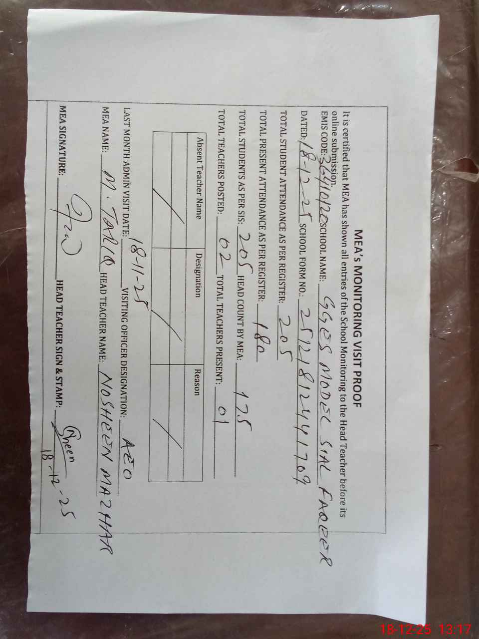 | Attendance Register | Head Teacher | MEA with School | Visit Proof |