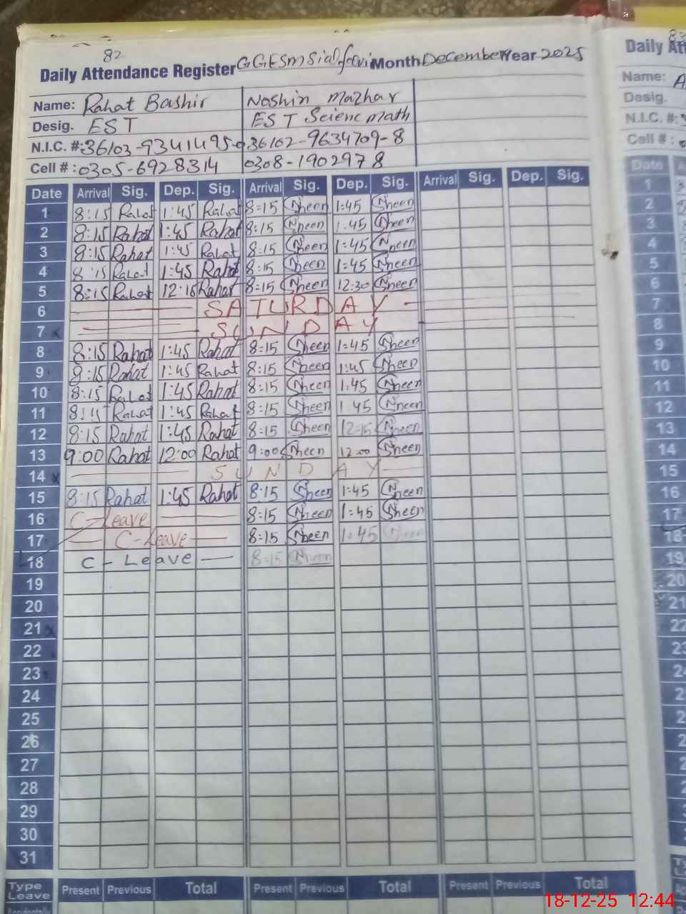 | CNIC | Full Name | Designation | R/C | Absence During Last Calender Month |