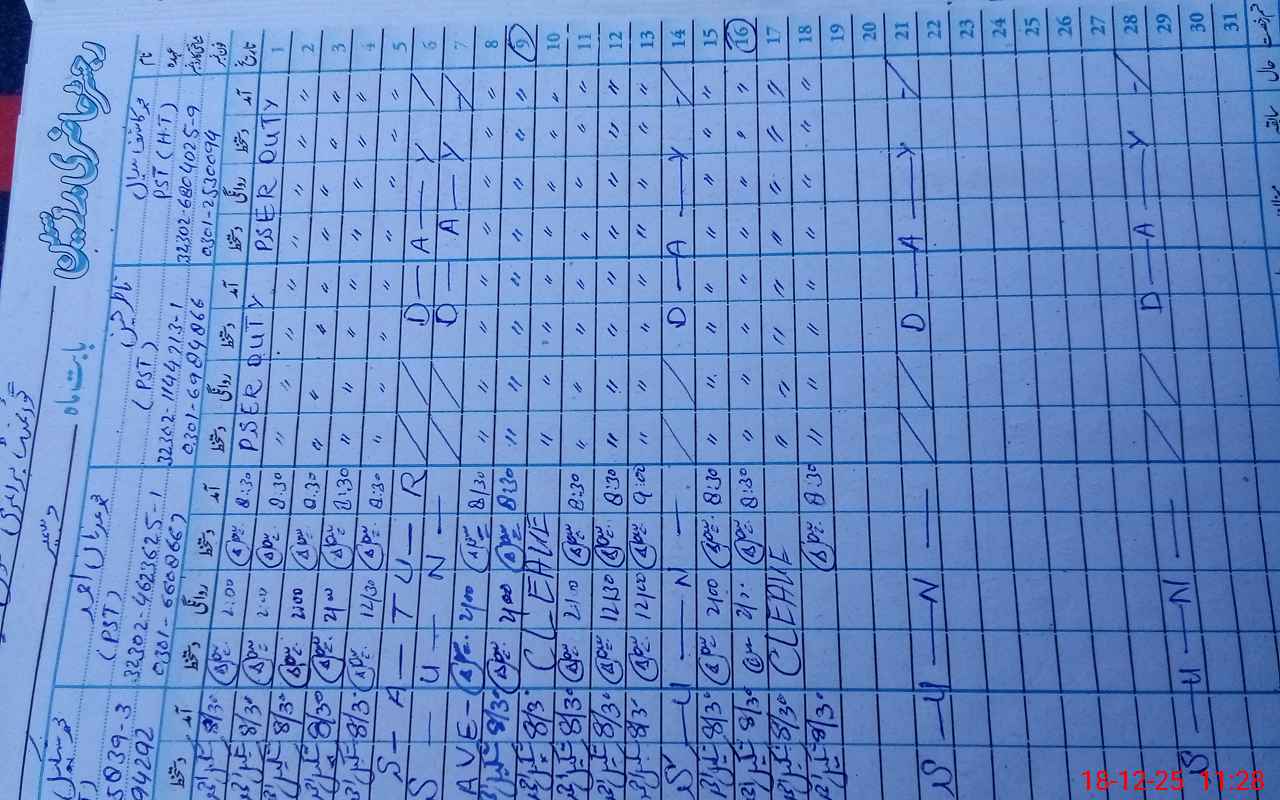 | CNIC | Full Name | Designation | R/C | Absence During Last Calender Month |