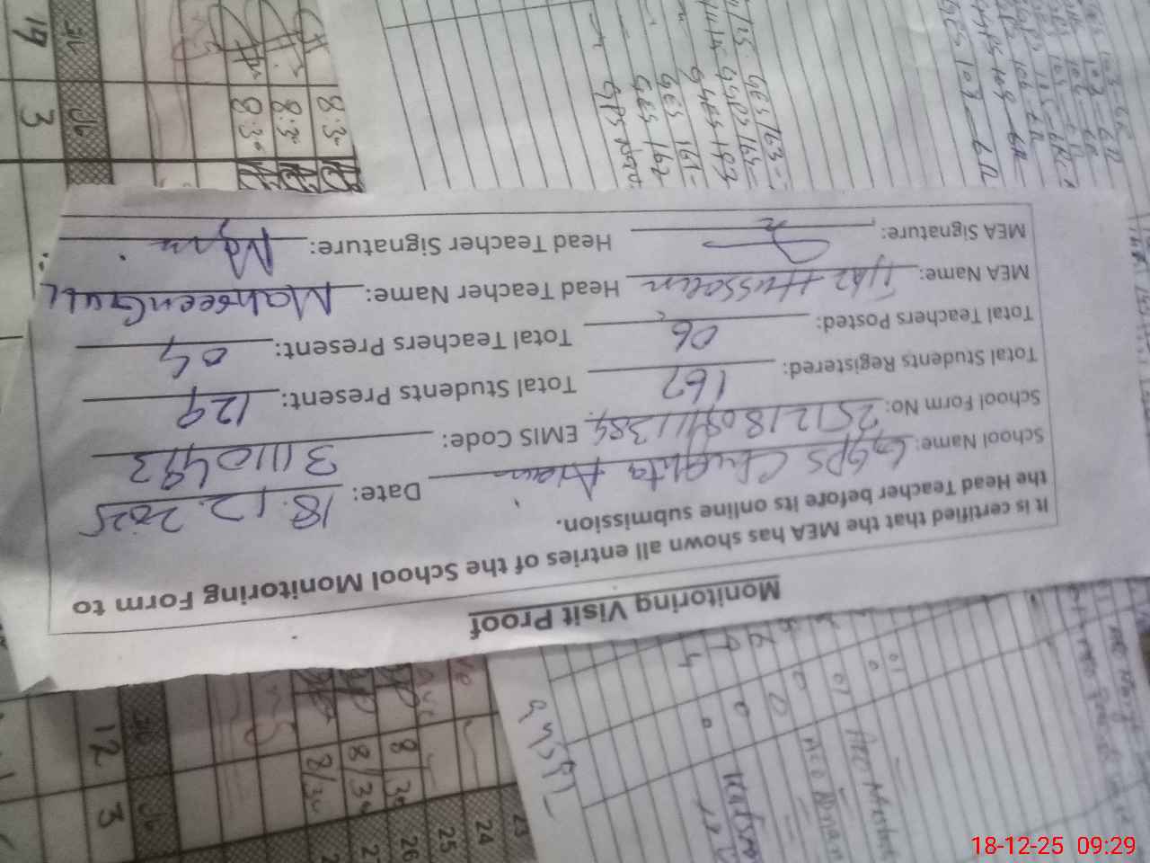 | Attendance Register | Head Teacher | MEA with School | Visit Proof |