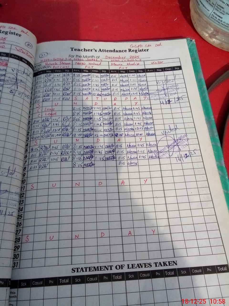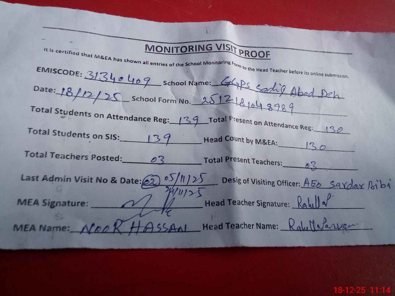 | Attendance Register | Head Teacher | MEA with School | Visit Proof |