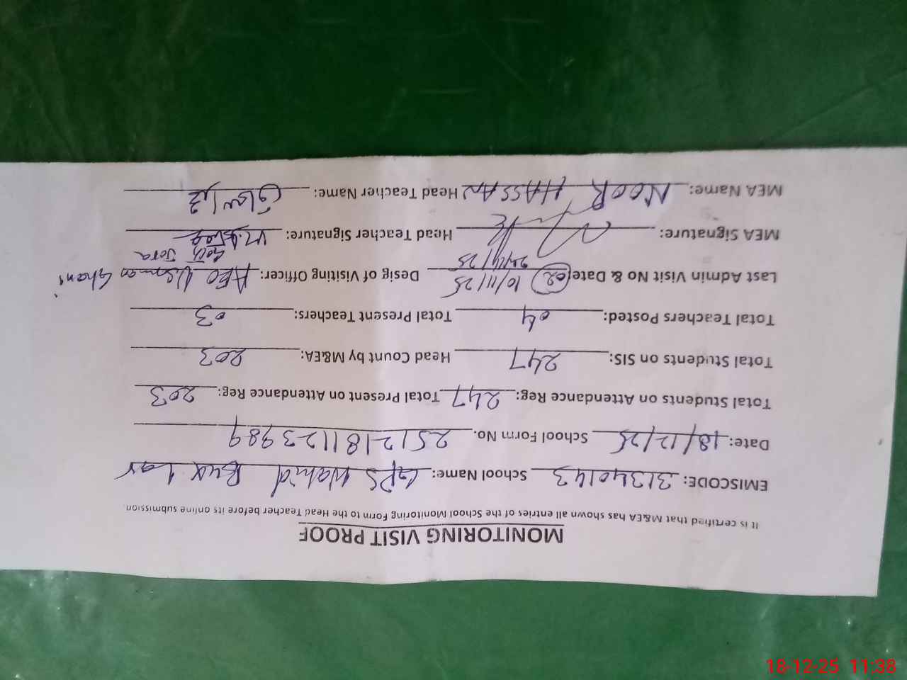 | Attendance Register | Head Teacher | MEA with School | Visit Proof |