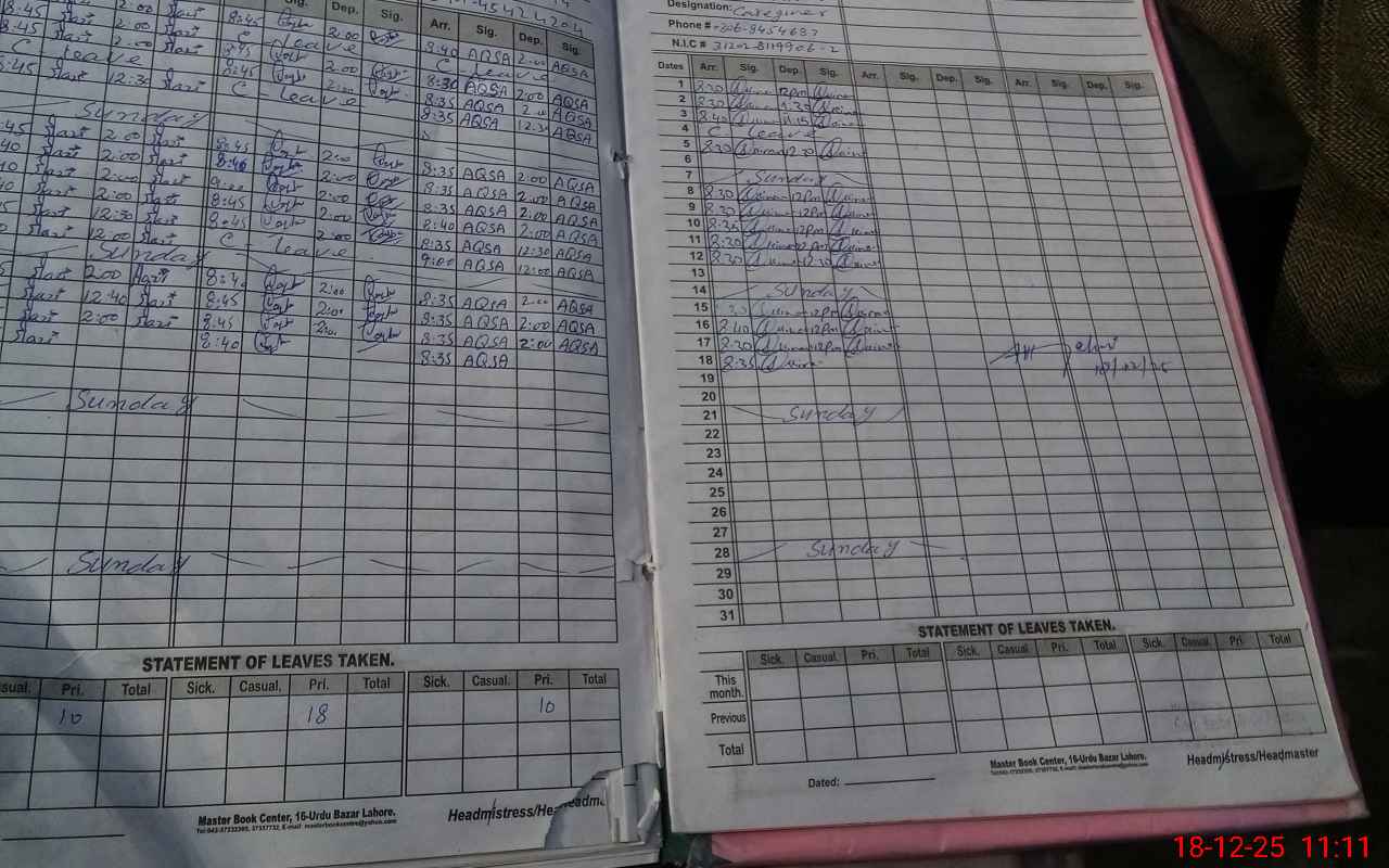 | CNIC | Full Name | Designation | R/C | Absence During Last Calender Month |