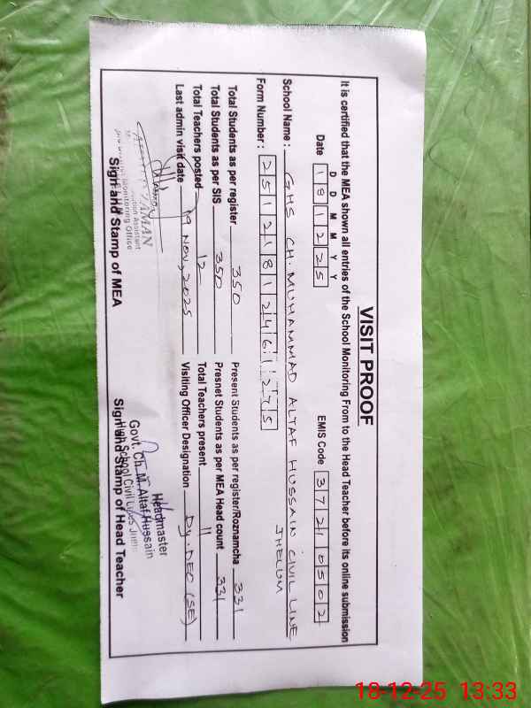 | EMIS Code: 37210502 | Name of School: GHS CH. MUHAMMAD ALTAF HUSSAIN CIVIL LINES JHELUM | |||